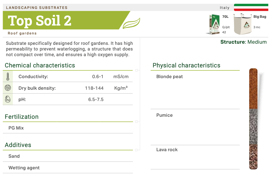 Substrate designed for roof gardens and landscaping, ideal for ensuring high permeability and preventing waterlogging. Composed of blond peat (40 %), pumice (35 %) and volcanic lapilli (25 %), it offers a medium structure that improves soil aeration and long-term stability. The pH varies between 6.5 and 7.5, while the conductivity is between 0.6 and 1.0 mS/cm. Enriched with 0.75 kg/m³ NPK 14-16-18 fertiliser, it is ideal for supporting the healthy growth of decorative and functional plants.